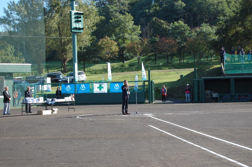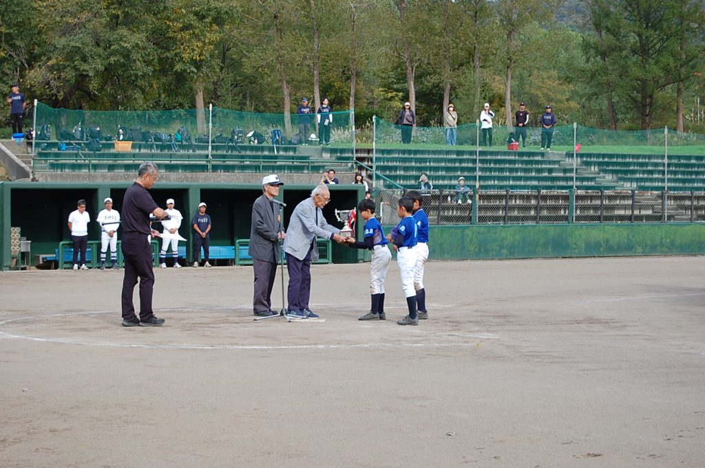 決勝の熱戦を終え、優勝の「恵み野ロイヤルズ」、準優勝の「空知ファイヤーズ」に、岸本邦宏 名誉会長よりトロフィー・記念品を贈らせて頂きました。