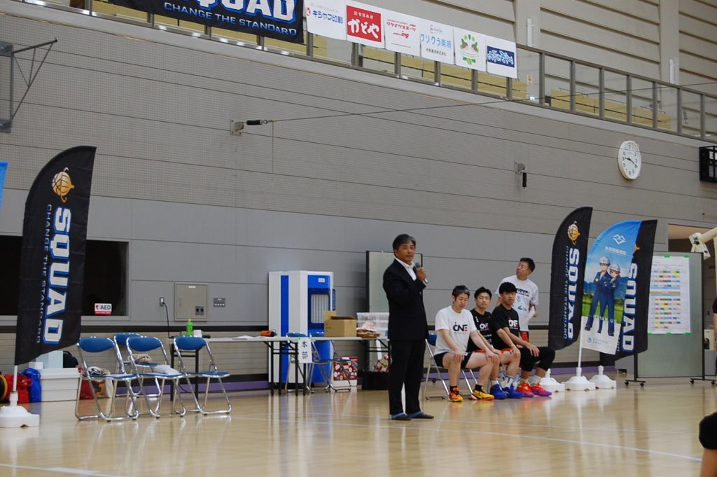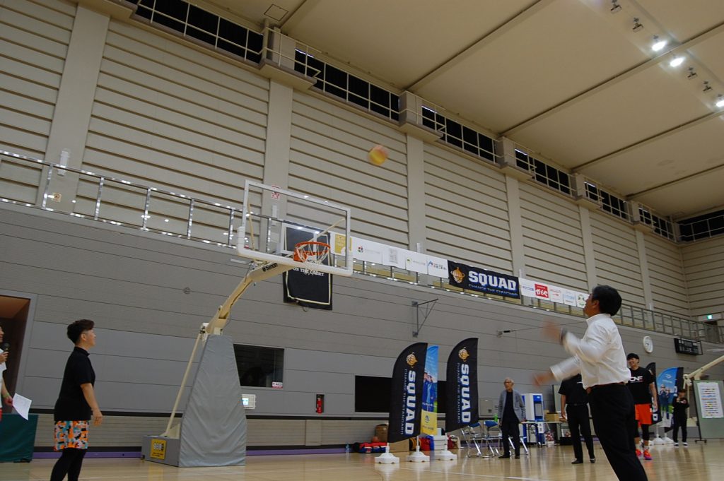 28日のSQUAD開会式には、南部真樹社長(丸庭佐藤建設)が駆けつけ、ファーストシュートをなんと「1発」で決めました!🏀 😯