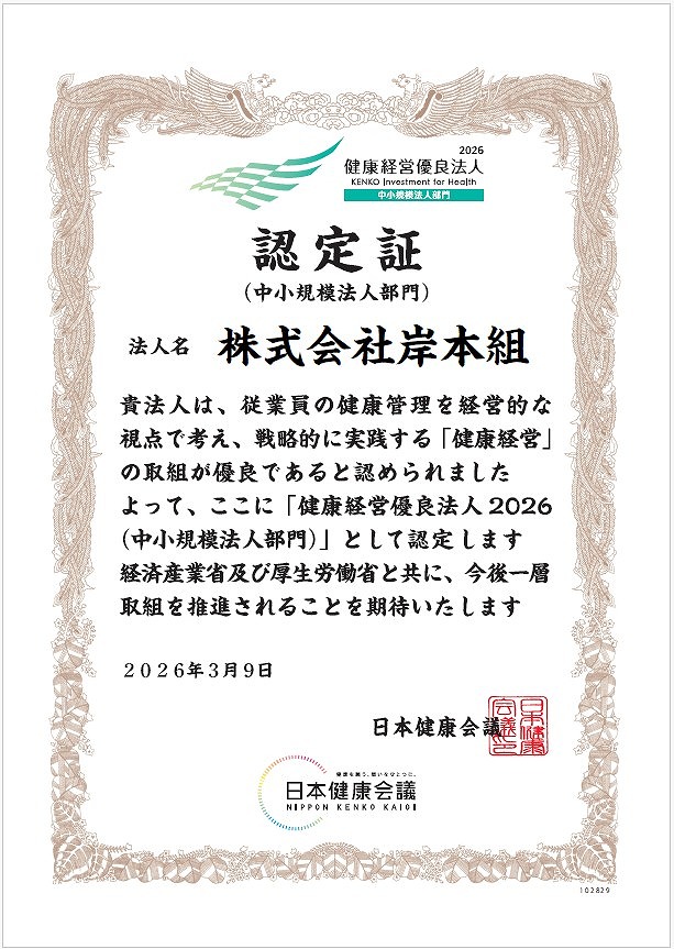 健康経営優良法人2026の認定を9年連続で頂きました/岸本組