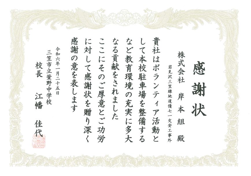 1月25日に、岸本組で施工中の「岩見沢三笠線地道債71交安工事外」で、地域貢献活動の 一環として三笠市立萱野中学校様の通学路兼駐車場の除排雪を、地域貢献として行なったことに 対して同校より、感謝状が贈呈されました。